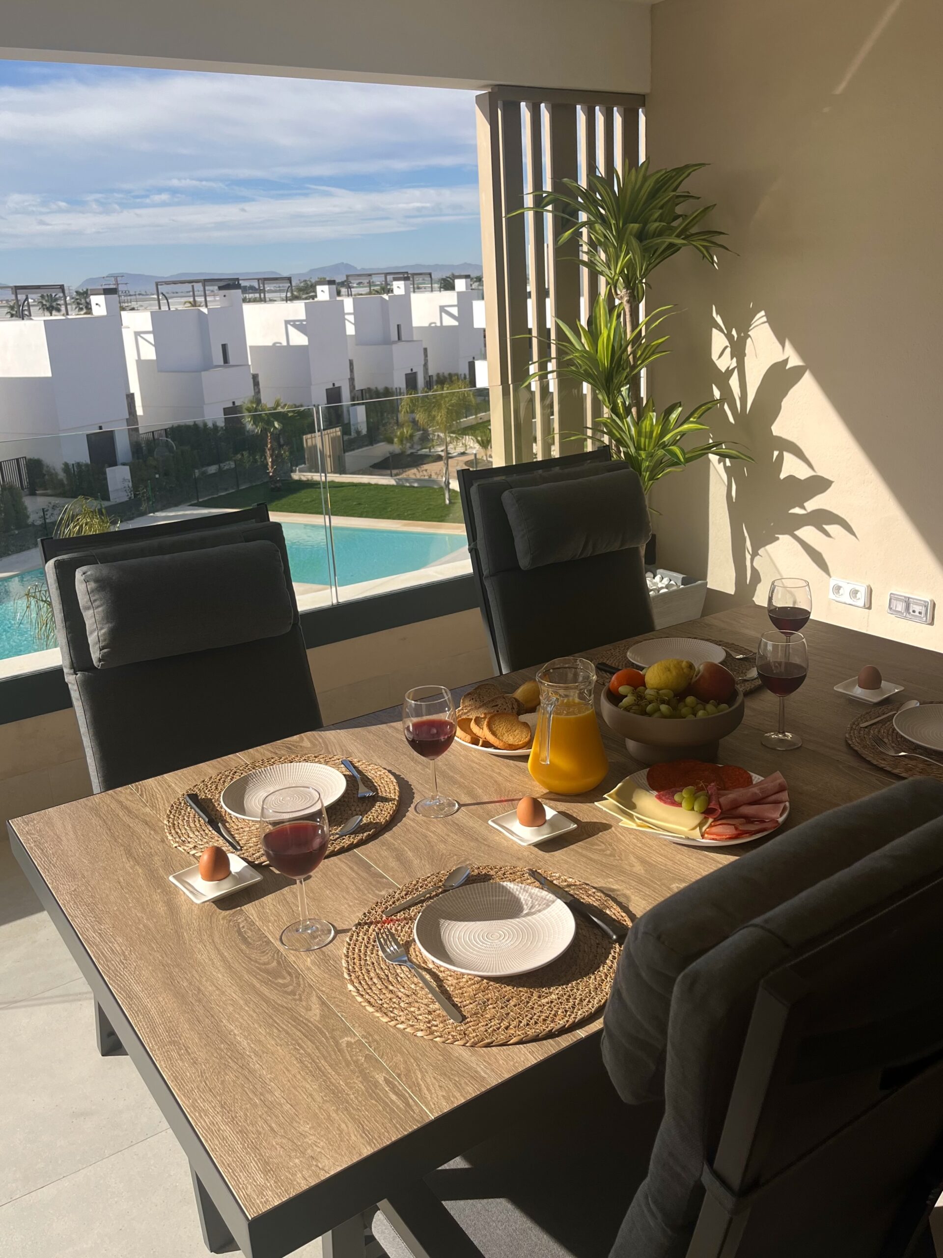 Je ziet het overdekte balkon met uitzicht op het zwembad, de ideale plek om een boekje te lezen in de zon, tapas te eten en ’s avonds van een prachtige zonsondergang te genieten
